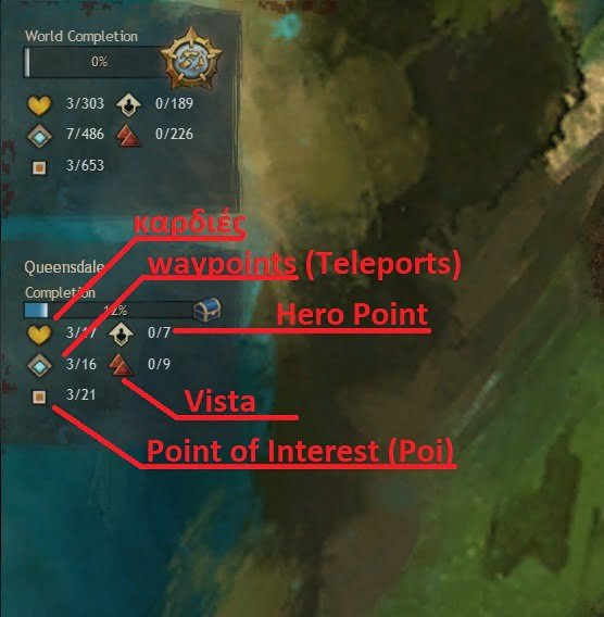 Hero Points: Τα Hero Points τα παίρνουμε είτε παλεύοντας με κάποιο NPC, είτε απαντάμε σε ερωτήσεις του (σε μορφή quiz/γρίφου), είτε κάνοντας commune/interact πατώντας το “F”. Με τους πόντους που κερδίζουμε, μαθαίνουμε τα skills ή τα specializations του παίκτη μας (τα elite specializations είναι του expansion). Δεν έχει σημασία ποια θα μάθουμε πρώτα και ποια όχι, γιατί έτσι και αλλιώς θα πρέπει να τα μάθουμε όλα.