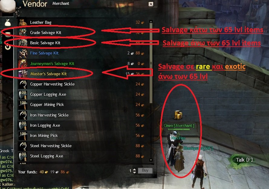 Salvage Kits τα βρίσκουμε στους merchants (όπως δείχνει πάνω στην εικόνα). Τα materials τα πουλάμε ή τα αποθηκεύουμε (όπως δείχνει κάτω στην εικόνα) ώστε να τα πουλήσουμε αργότερα ή για κάνουμε
